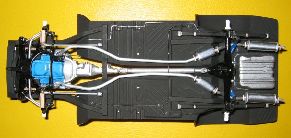 And here the assembled, finished interieur. Note the Challenger dash-emblem and the vinyl carpet-insert on driver´s side Next step is the chassis assembly, I glued the engine in place and detailed the chassis with brake and fuel lines. The exhaust pipes and mufflers are from the AMT/Ertl Challenger and I added the pipe clamps from the parts box. The shock absorbers are scratchbuild while there are none in the original kit.