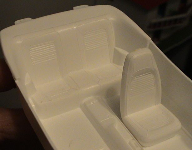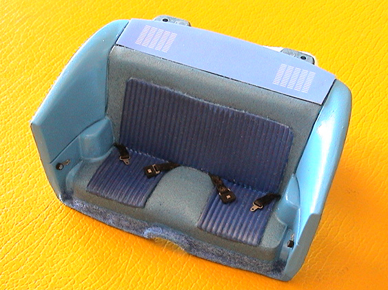 bench-like form. To achieve this I sanded of the original pattern and glued customized parts made from a computer hard-disk cable to the seats and rear bench. After priming and painting it in two-tone color it looks